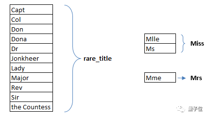事实上,有些称号,如’Dona’, ‘Lady’, ‘Countess’, ‘Capt’, ‘Col’, ‘Don’, ‘Dr’, ‘Major’, ‘Rev’, ‘Sir’和’Jonkheer ‘,出现频率很低,可以划为同一类,作为rare_title类。此外,称号’Mlle’和’Ms’可以放在’Miss’中,’Mme’可以用’Mrs’替换。