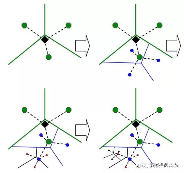 现在通过聚类我们获得了字典,但这里又有一个问题。回想我们平时查字典的过程,不可能直接打开一个一个去找吧,我们会利用目录,首字母等方法方便我们查找。这里也一样,一个个去查找速度太慢了,因此我们将字典构建成一个K叉树的结构来加速查找。如下图所示: