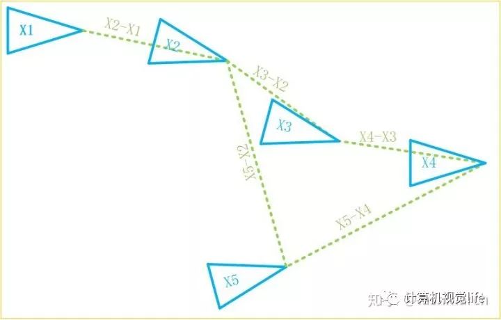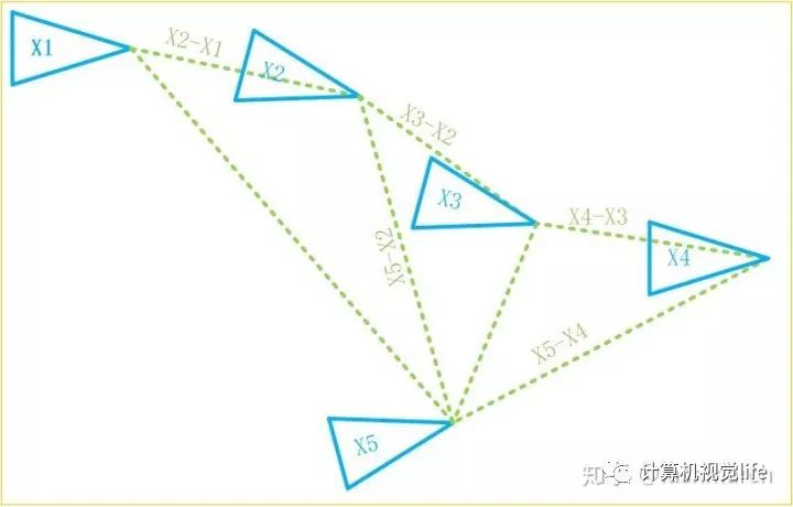 那现在又有新的问题了,我们怎么知道可以由第二帧推算第五帧位姿呢?就像下图,可能第一帧、第三帧也可以呀。确实,我们之所以用前一帧递推下一帧位姿,因为这两帧足够近,肯定可以建立两帧的约束,但是距离较远的两帧就不一定可以建立这样的约束关系了。找出可以建立这种位姿约束的历史帧,就是回环检测。