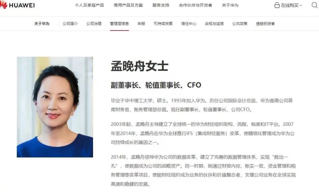 4 月 2 日消息,据华为官网最新信息显示,华为 CFO 孟晚舟现已担任华为副董事长、轮值董事长。孟晚舟毕业于华中理工大学,硕士,1993 年加入华为。历任公司国际会计总监、华为香港公司首席财务官、账务管理部总裁。