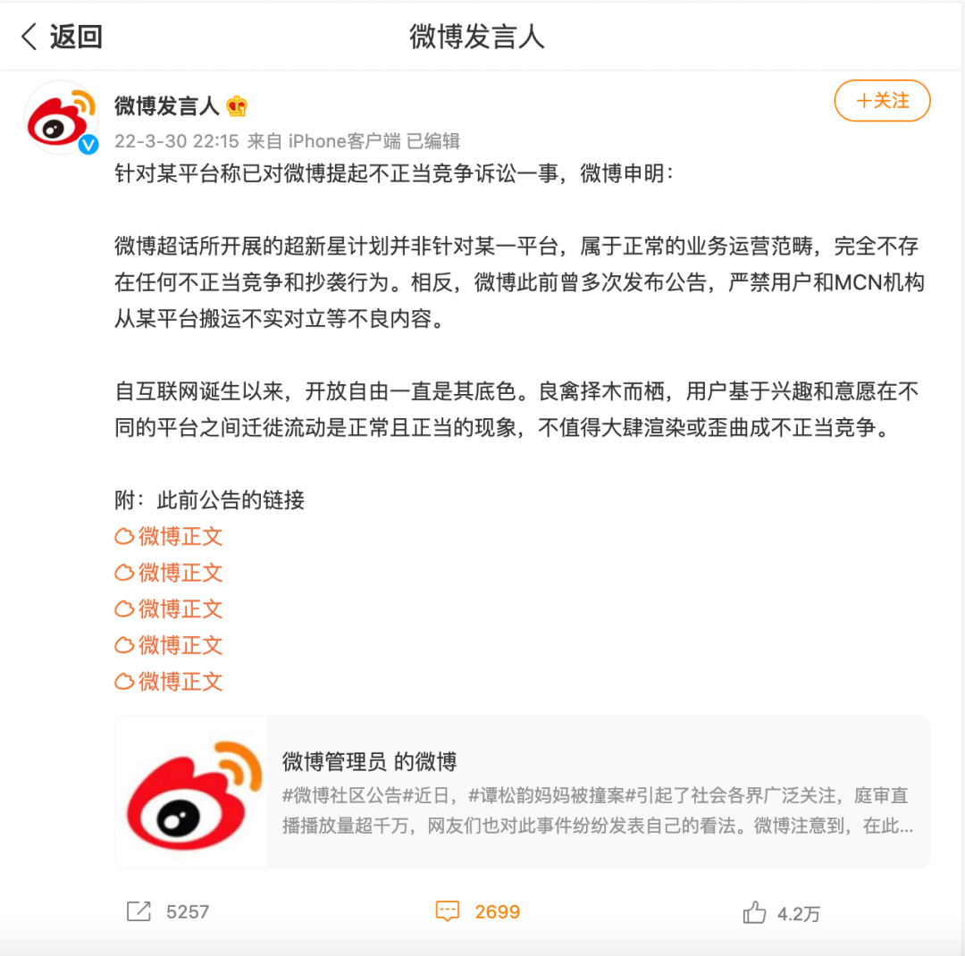 30 日晚间,微博方面对此回应称:微博超话所开展的超新星计划并非针对某一平台,属于正常的业务运营范畴,完全不存在任何不正当竞争和抄袭行为。