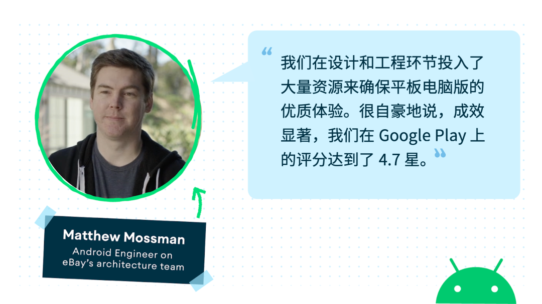 eBay 移动设备架构团队的 Android 工程师 Matthew Mossman 说: "通过公开反馈渠道得知,在大屏幕设备上投入开发资源的好处显而易见。"通过针对大屏幕设备优化应用,eBay 开发者构建了更好的用户体验,进一步提高了用户满意度。