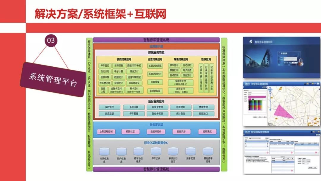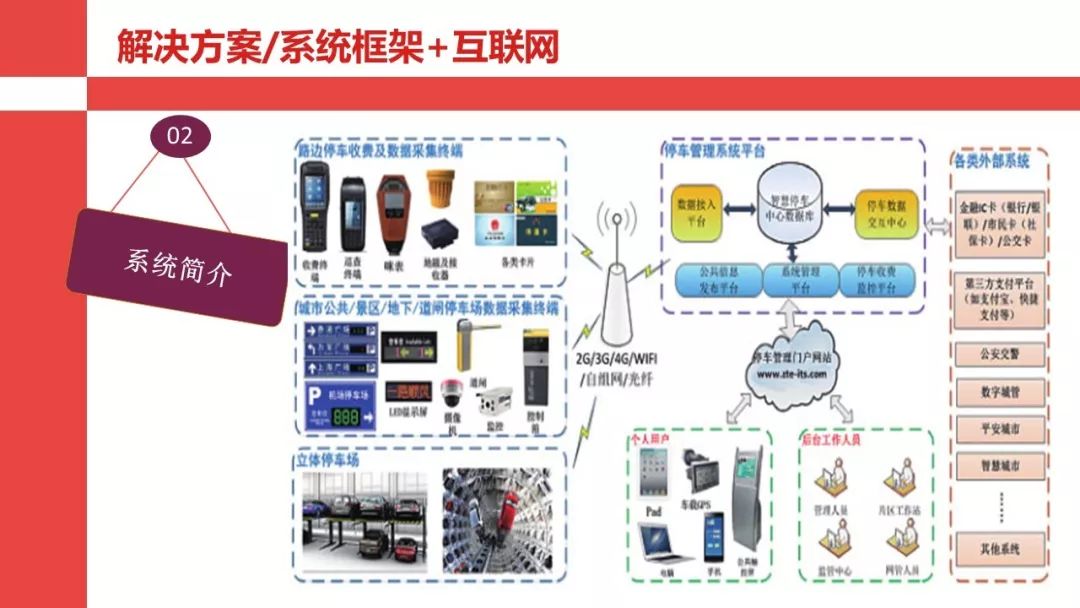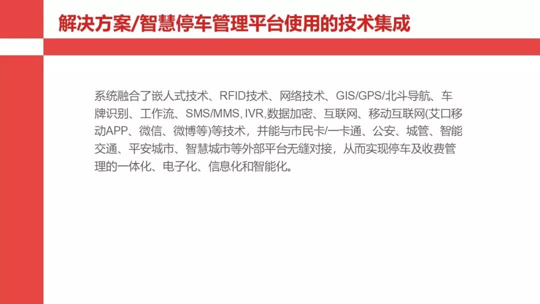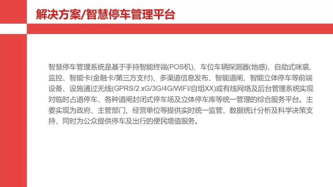 智慧停车管理系统是基于手持智能终端(POS机)、车位车辆探测器(地感)、监控、智能卡(金融卡/第三方支付)、多渠道信息发布、智能道闸、智能立体停车等前端设备、设施通过无线(GPRS/2.xG/3G/4G/WIFI/自组XX)或有线网络及后台管理系统实现对临时占道停车、各种道闸封闭式停车场及立体停车库等统一管理的综合服务平台。