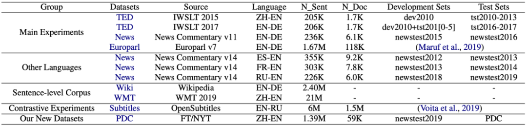 篇章翻译最常用的数据集是 News Commentary 与 TED Talks。这两份数据集仅包含大概 20 万句对,不到 1 万篇文档,而且测试集与训练集分布高度类似,有很高的过拟合的嫌疑。甚至有些工作 [5,6,7] 对句级别模型设定 dropout=0.1,篇章级别模型设定 dropout=0.2,并在此基础上宣称取得了提升。而其中可能潜在的正则化与过拟合的问题未被真正探讨过。