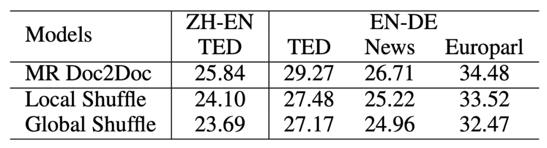 从表 3 的上半部分可以看到,单分解度篇章到篇章 (SR Doc2Doc) 的训练的确降低了翻译质量。但利用多分解度篇章到篇章 (MR Doc2Doc) 的训练,可以得到最好的结果。值得注意的是,这一提升无需增加任何额外的参数。