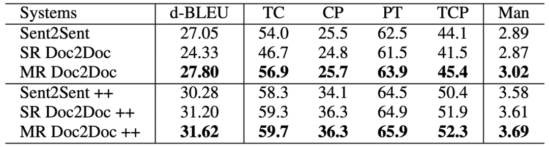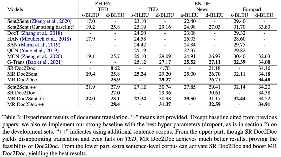 实验结果如下(++ 表示额外的平行句子级别语料):