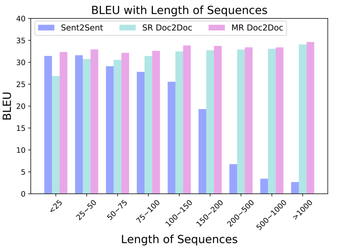 用这种训练方式,模型能翻译超过 2000 词的长序列(即篇章),而且依旧能对几十个词的短序列(即句子)进行翻译。