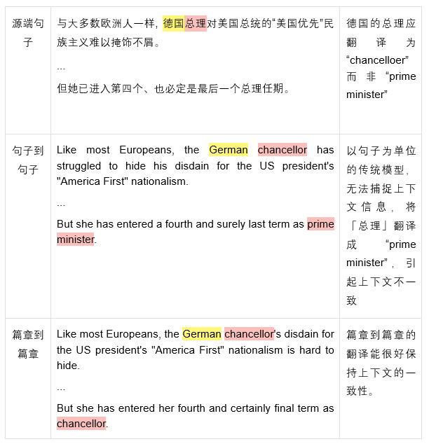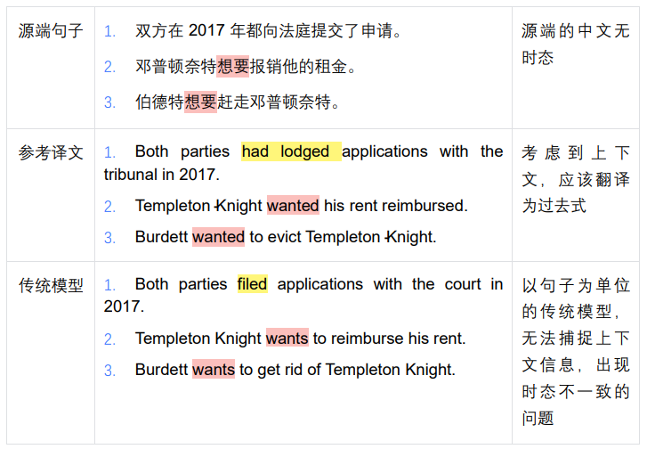 而当前的机器翻译模型主要以句子作为翻译的基本单位,逐句逐句地进行翻译。这类方法的问题显而易见:无法有效捕捉到上下文的信息,在翻译的过程中容易出现与上下文不一致、引用错误等问题,如下面这个例子: