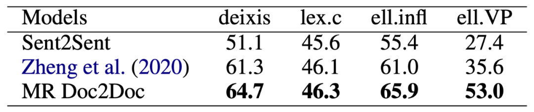 除 BLEU 外,研究者也证实了多分解度篇章到篇章的训练也能提升篇章翻译在具体语言学指标中的上下文一致性,如表 4 所示。
