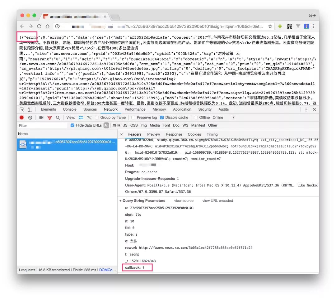 我们都知道 JSONP 需要定义一个 callback 回调名称,最后数据加载的时候执行这个回调返回数据才算成功。可以看到图里面虽然加了 callback=? 但是并没有对 ? 进行替换,服务端那边应该也是增加了校验这种情况下并没有给我们添加回调方法名。实际上服务端这里的处理都是没问题的,因为即使 ? 被添加到数据里了也会有问题,因为 ? 是逻辑运算符并不能被定义成变量。而没有加回调方法的后果就是虽然接口返回正常,但是最终数据没有人接收就“野”了。