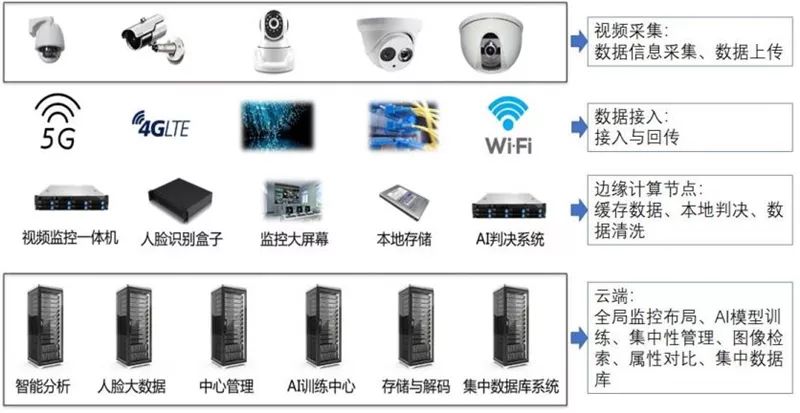 基于上述诉求,可以将监控数据分流到边缘计算节点(边缘计算 业务平台),从而有效降低网络传输压力和业务端到端时延。此外,视频监控还可以和人工智能相结合,在边缘计算节点上搭载 AI 人工智能视频分析模块,面向智能安防、视频监控、人脸识别等业务场景,以低时延、大带宽、快速响应等特性弥补当前基于 AI 的视频分析中产生的时延大、用户体验较差的问题,实现本地分析、快速处理、实时响应。云端执行 AI 的训练任务, 边缘计算节点执行 AI 的推论,二者协同可实现本地决策、实时响应,可实现表情识别、行为检测、轨迹跟踪、热点管理、体态属性识别等多种本地 AI 典型应用。