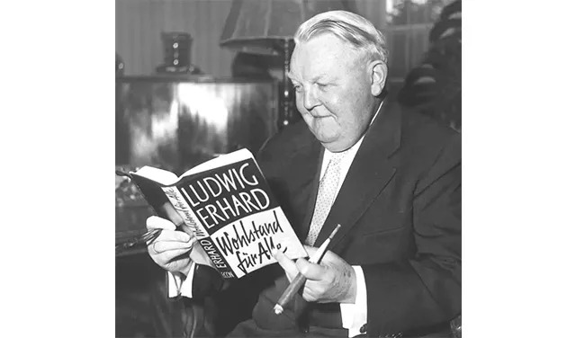 艾哈德是个经历丰富的人。从小患小儿麻痹症,右腿致残,第一次世界大战中负伤,后来在法兰克福大学获得博士学位。1925年到1928年,在父母的企业里当过经理。1928年到1942年,他在纽伦堡一个经济观察研究所工作,一开始重点研究自由市场经济的弊端,纳粹上台后又将重点放在纳粹德国的统制经济上,他认为统制经济的本质是强制把人和经济捆绑在战争上。1944年,他发表了《战争财政和债务巩固》一文,文中隐含的假设是德国战败后经济如何重建。不知何因,纳粹忽略了这篇文章,否则他很可能被处死。战后,英美占领区发现了他的预见性和才能,1945年10月他被任命为巴伐利亚州经济部长,1948年又成为整个西区经济的负责人。1949年,他当选为联邦德国的第一任经济部长。后来,在1963到1966年,他还担任过联邦总理。
