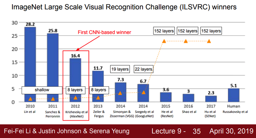 ImageNet 挑战赛冠军团队的分类错误率逐年变化情况(越低越好)。