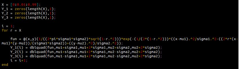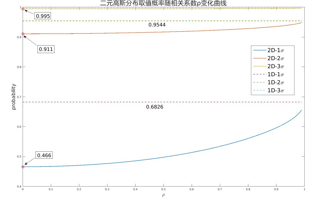 图1中,横坐标是变量X和Y的相关系数ρ,纵坐标是概率。2D-1σ(蓝线)表示X和Y都落在各自的1σ区域,即x∈(μ1-σ1,μ1+σ1)且 y∈(μ2-σ2,μ2+σ2)的概率;1D-1σ(紫虚线)表示一元高斯变量的值落在1σ区间内概率,即上文提到的0.6826。