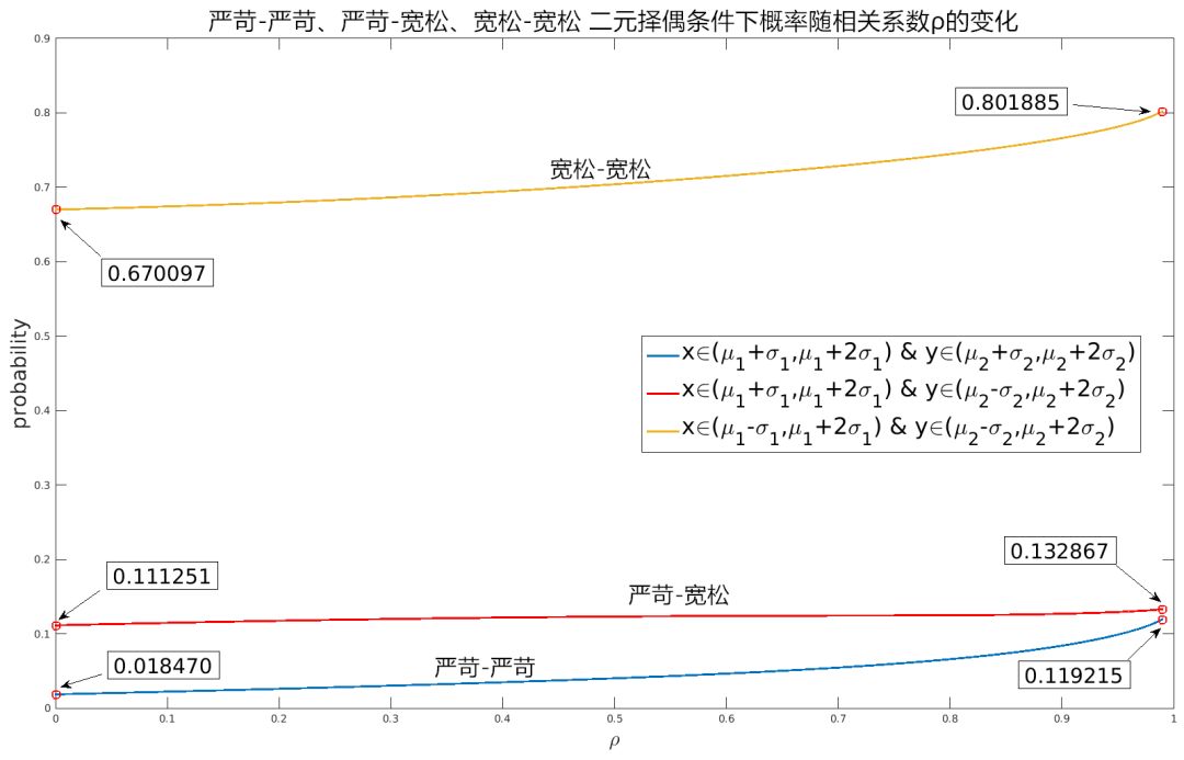 事实上,在现实生活中,我们能够选为择偶标准的指标之间的相关性都比较弱,也只有这样才能够多维度、全方位地评价一个人。你会把身高、勤奋度作为两个不同的择偶指标,但没必要把科研能力和顶级期刊论文发表数这两个相关性很强的指标单列为两个择偶标准。所以,我们要关注的更多的是当ρ比较小时的情况,也就是最差情况的概率。