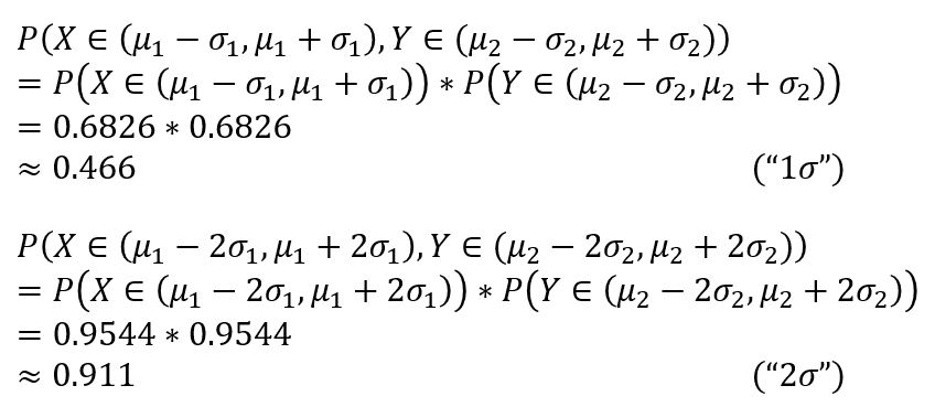 是否在二元正态分布下,两个变量同属1σ的区间(x∈(μ1-σ1,μ1+σ1) & y∈(μ2-σ2,μ2+σ2))的概率就是0.6826×0.6826=0.4659呢?
