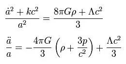 图中的两个弗里德曼方程源于爱因斯坦的广义相对论,它描述的是宇宙从炙热的大爆炸诞生之际,到冰冷的快速膨胀死亡期之间整个宇宙的模型。