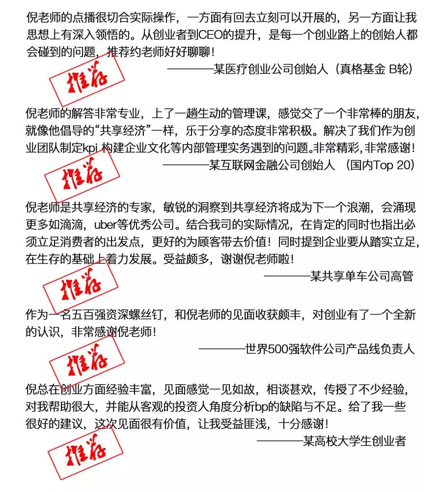 近几年,他为超过百家早期创业公司提供过顾问咨询服务,并担任共享单车、生鲜电商、智能家居、互联网金融、建材电商、K12公司、创业服务机构等多家从天使、A轮到上市公司的常年顾问。在多年的实战中,他形成了一套自己的、完整的创业实干理论。