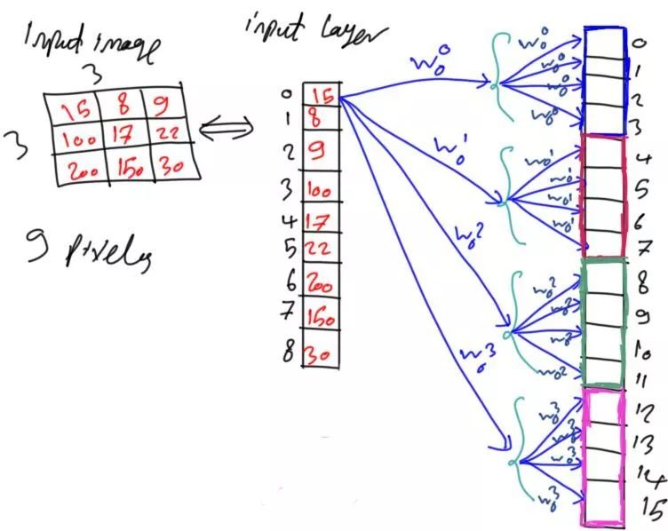 图7显示了每个像素到每个组中第一个神经元的连接,但每组中的每个像素与每个神经元还是相互连接,该网络仍然是全连接网络。