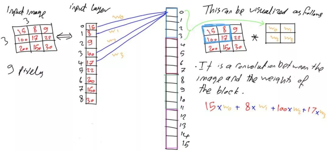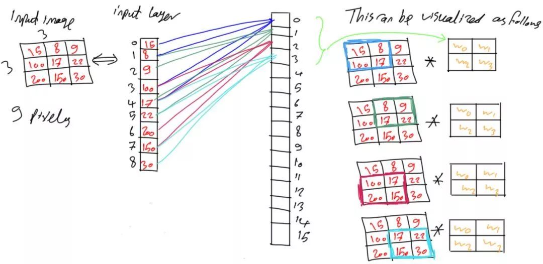 现在只有4个权重分配给同一组中的所有神经元,那么这4个权重如何涵盖9个像素点呢?让我们看看这是如何处理的吧!