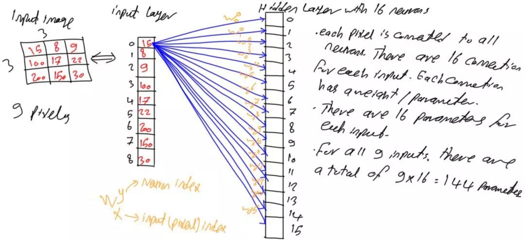 由于网络是全连接网络,这意味着第i层的每个神经元与第i-1层中的所有神经元相连。即隐藏层中的每个神经元都与输入层中9个神经元相连。换句话说,每个输入像素与隐藏层中的16个神经元相连,其中每条连接都具有相应的参数(权重)。通过将每个像素与隐藏层中的所有神经元相连,如图4所示,该网络具有9x16=144个参数(权重)。
