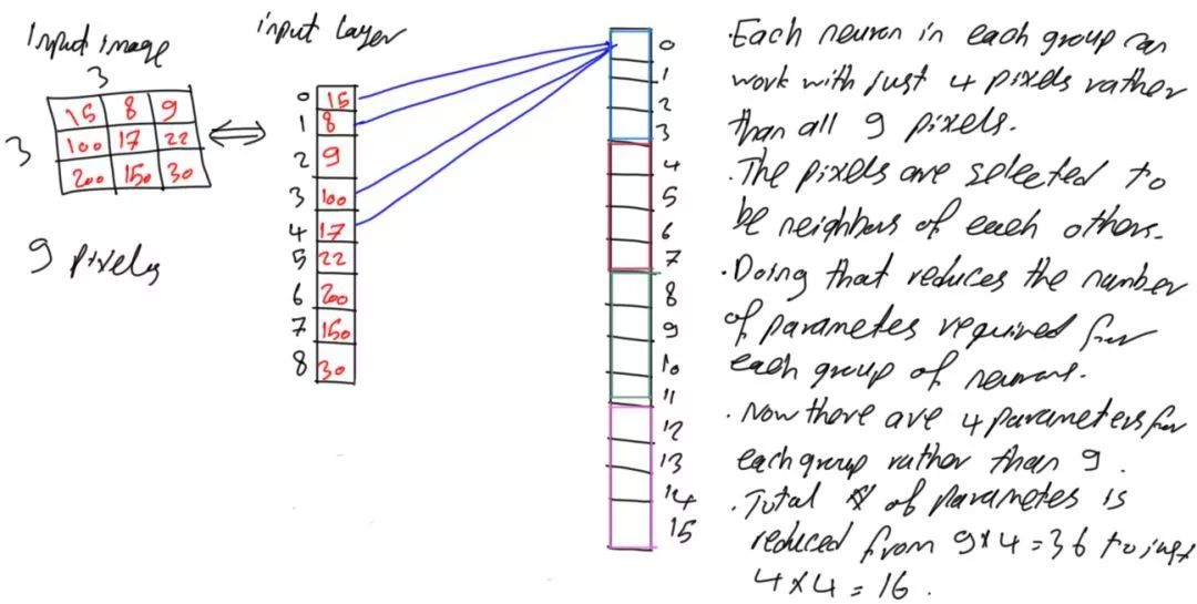 之前所述内容使得每个神经元接受所有像素,若存在接受4个输入的函数f(x1,x2,x3,x4),则这意味着要基于所有这4个输入来进行决定。如果只有2个输入,但其输出结果与使用4个输入的结果相同,那么将不必使用所有的这4个输入,只需给出对结果有影响的2个输入即可。借鉴该思想,每个神经元接受输入的9个像素,若能使用更少的像素获得相同或更好的结果就大大降低了参数数量,因此可以朝着这个方向优化网络参数。