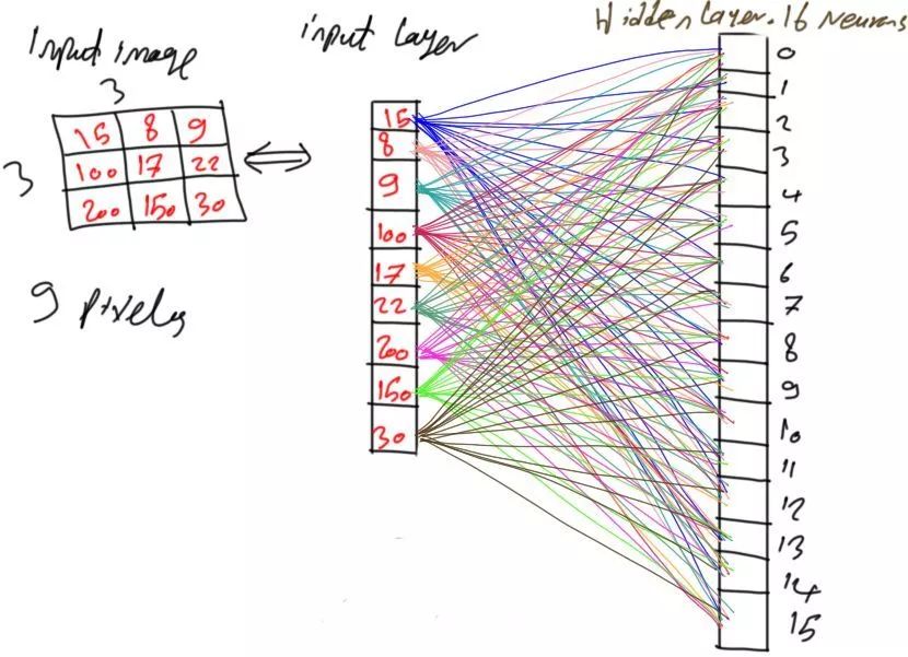 输入层与隐藏层(Hidden Layer)相连,输入层的输出又输入给隐藏层,隐藏层学习如何将图像像素转换为代表性特征。假设在图3中有一个具由16个神经元的单个隐藏层。
