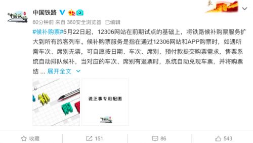 今天,中国铁路总公司官方微博正式发布的消息,今日起,12306网站在前期试点的基础上,将铁路候补购票服务扩大到所有旅客列车。