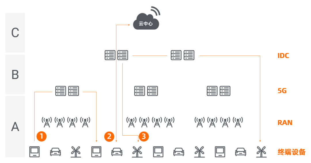 5G,让边缘计算继续下沉延伸到运营商地市城域网,将来会连接着数以万计的MEC节点,这是第二层边缘计算分布节点,提供小微规模集中算力,用于覆盖地市一级的就近计算和流量调度。因为MEC节点距离终端更近了一步,更低的时延和更低的成本,让更多原本只能在终端进行的计算能够上移至边缘,从而形成算力集约,最终带来成本收益。而且,5G释放出来更多的终端到边缘之间的网络传输质量管控能力,可以让我们基于场景来优化“端-边”的网络服务质量,达到降低成本的同时并未降低用户体验。