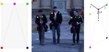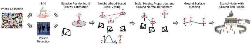 首先,对某个场景的图片集使用SfM来获得相机参数和稀疏的结构,随后在图片中检测2D的人体躯干点,并且估计每个人相对相机的距离和旋转角以及全局的重力向量。接着对一系列重建场景的可能尺度做彻底的检验,进行排序并近似地语义三角测量。然后进行尺度的精调,用已知的人体身高统计信息和局部地面放置3D人体。最后,用泊松表面重建法恢复地面。为了可视化,放置到3D场景中的人体衣物颜色是从图像中采集的,同时地面的纹理也用图像和语义像素标记来渲染。