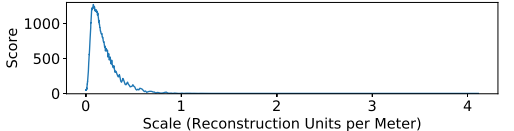 原则上,s可以用重建场景中两个点的绝对距离来决定。但是由于距离信息的缺乏,作者提出了利用近似的语义三角测量的方法来估计,并且用大量的图片对s进行投票评分。假设的尺度s由式(8)给出评分,其中M是二进制的表示符号,决定第 i 个人在尺度 s 上是否符合三角测量,ω为系数。作者在实验中发现令 ω 为图片中检测到的目标数的倒数时算法会有更好的性能。