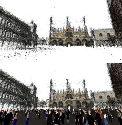近年来,虚拟漫游系统变得流行起来,允许用户体验和探索他们没有到过的地方(如Google Earth VR)。这些应用使用了3D重建的方法来建立真实场景的模型。虚拟场景的感知体验固有地与重建结果的完整性有关,当前,地面重建和瞬态物体建模是大尺度场景重建的两大难点。由于相对少的地面匹配点,地面重建通常比较困难,而瞬态物体的放置比如移动的人和车无法用多视图同步也同样困难。此外,自动地恢复大场景的绝对尺度在缺少GPS信息的(室内或建筑密集等)情况下也存在问题。在本文中,作者致力于增强SfM + MVS的重建结果,尤其是从互联网图片集中重建3D场景,并且把从单张图片中检测到的人放置到场景中。图1展示了地面重建和3D场景中的人体放置。