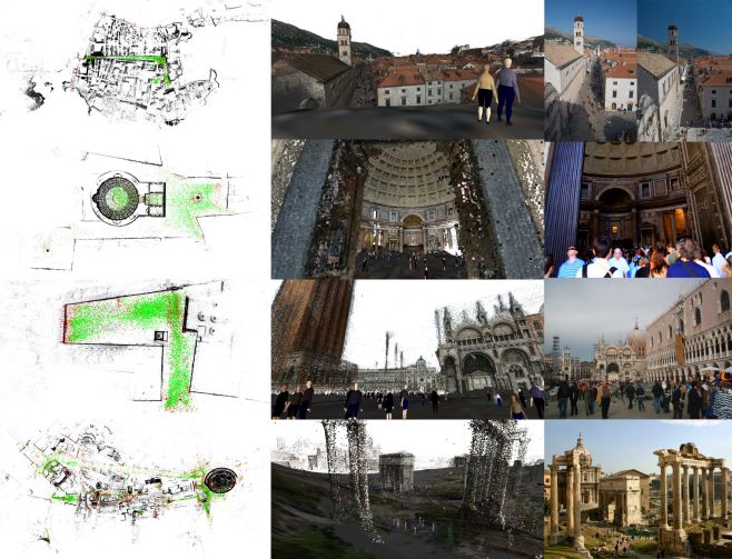 本文作者在众多大规模图片集中测试了算法,包括著名的Cornell Arts Quad数据集。由于没有ground truth,在无序的互联网图片集中评估算法有一定难度。作者通过测量场景中建筑间的距离,手动建立了一个ground truth模型用于距离和尺度的估计。