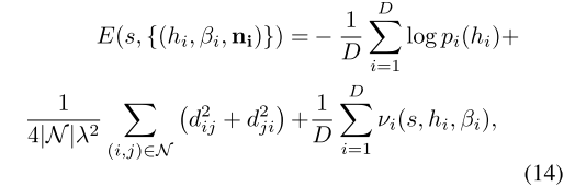 获得了尺度的初始估计 s 后,接下来需要同时优化这个尺度、每个人的高度 h 和对应于每个人站位的地平面法向量n。作为优化的一部分,作者还计算了每个人身体躯干的高度 t = βh,β是躯干到身体高度的比例。优化目标函数如式(14)所示,该式结合了:1)人体高度分布的先验信息 p(高斯混合模型);2)局部平面性质的先验信息 d,利用了两个相邻的人之间的地面是平滑的这一假设;3)可见性约束 v。