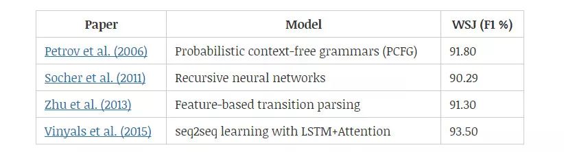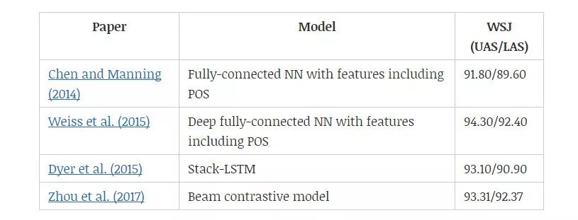 表 3.1:依存句法分析(UAS/LAS=未标记/标记的 Attachment 分数;WSJ=The Wall Street Journal Section of Penn Treebank)