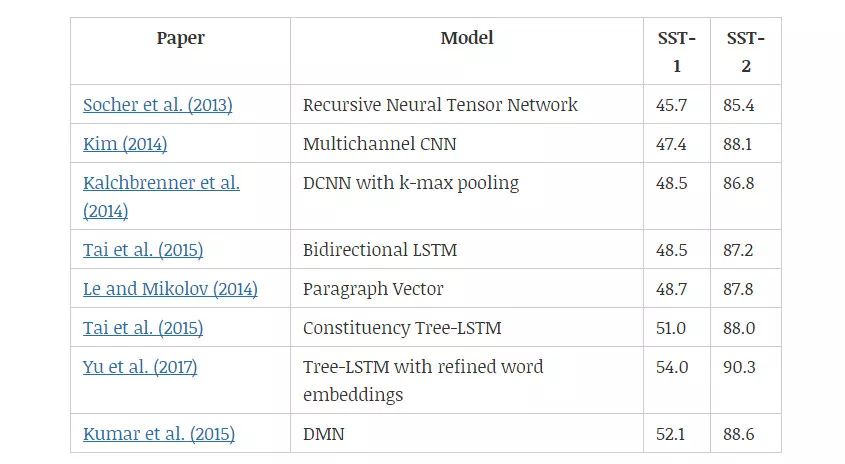 Socher 等人(2013)和 Tai 等人(2015)都是通过成分解析树及递归神经网络来改善语义表征。另一方面,树形 LSTM(tree-LSTM)比线性双向 LSTM 表现更好,说明树结构能够更好地捕捉自然句子的句法特性。Yu 等人(2017)提出用情感词汇微调预训练的词嵌入,然后基于 Tai 等人(2015)的研究观察改进结果。
