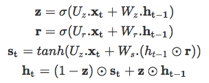 另一个门控 RNN 变体是 GRU,复杂度更小,其在大部分任务中的实验性能与 LSTM 类似。GRU 包括两个门:重置门和更新门,并像没有记忆单元的 LSTM 那样处理信息流。因此,GRU 不加控制地暴露出所有的隐藏内容。由于 GRU 的复杂度较低,它比 LSTM 更加高效。其工作原理如下: