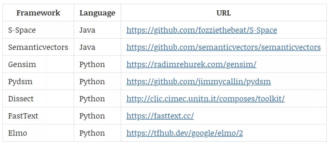 下表 1 提供了用于创建词嵌入的现有框架,它们都可以训练词嵌入并进一步与深度学习模型相结合: