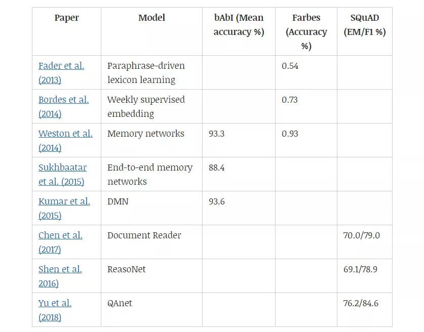 QA 问题有多种形式,有的研究者根据大型知识库来回答开放性问题,也有的研究者根据模型对句子或段落的理解回答问题。对于基于知识库的问答系统,学习回答单关系查询的核心是数据库中找到支持的事实。