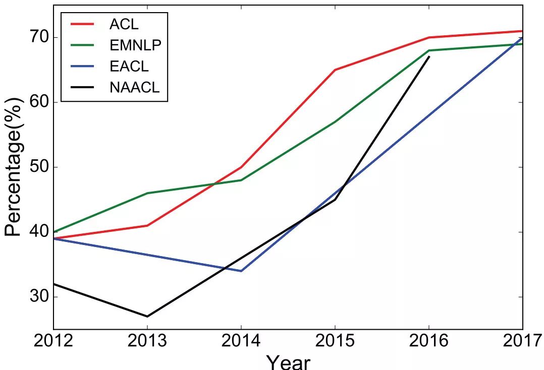 图 1:过去 6 年 ACL、EMNLP、EACL、NAACL 会议上深度学习论文的比例(长论文)。