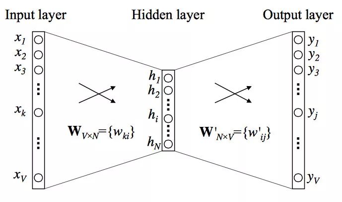 如图 4 所示,CBOW 模型就是一个简单的全连接神经网络,它只有一个隐藏层。输入层是上下文词的 one-hot 向量,它有 V 个神经元(词汇量),而中间的隐藏层只有 N 个神经元,N 是要远远小于 V 的。最后的输出层是所有词上的一个 Softmax 函数。层级之间的权重矩阵分别是 V*N 阶的 W 和 N*V 阶的 W',词汇表中的每一个词最终会表征为两个向量:v_c 和 v_w,它们分别对应上下文词表征和目标词表征。若输入的是词表中第 k 个词,那么我们有: