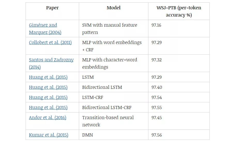 WSJ-PTB(the Wall Street Journal part of the Penn Treebank Dataset)语料库包含 117 万个 token,已被广泛用于开发和评估词性标注系统。Giménez 和 arquez(2004)在 7 个单词窗口内采用了基于人工特征的一对多 SVM,其中有些基本的 n-gram 模式被评估用来构成二元特征,如:「前一个单词是 the」,「前两个标签是 DT NN」等。词性标注问题的一大特征是相邻标签之间的强依赖性。通过简单的从左到右标注方案,该方法仅通过特征工程建模相邻标签之间的依赖性。