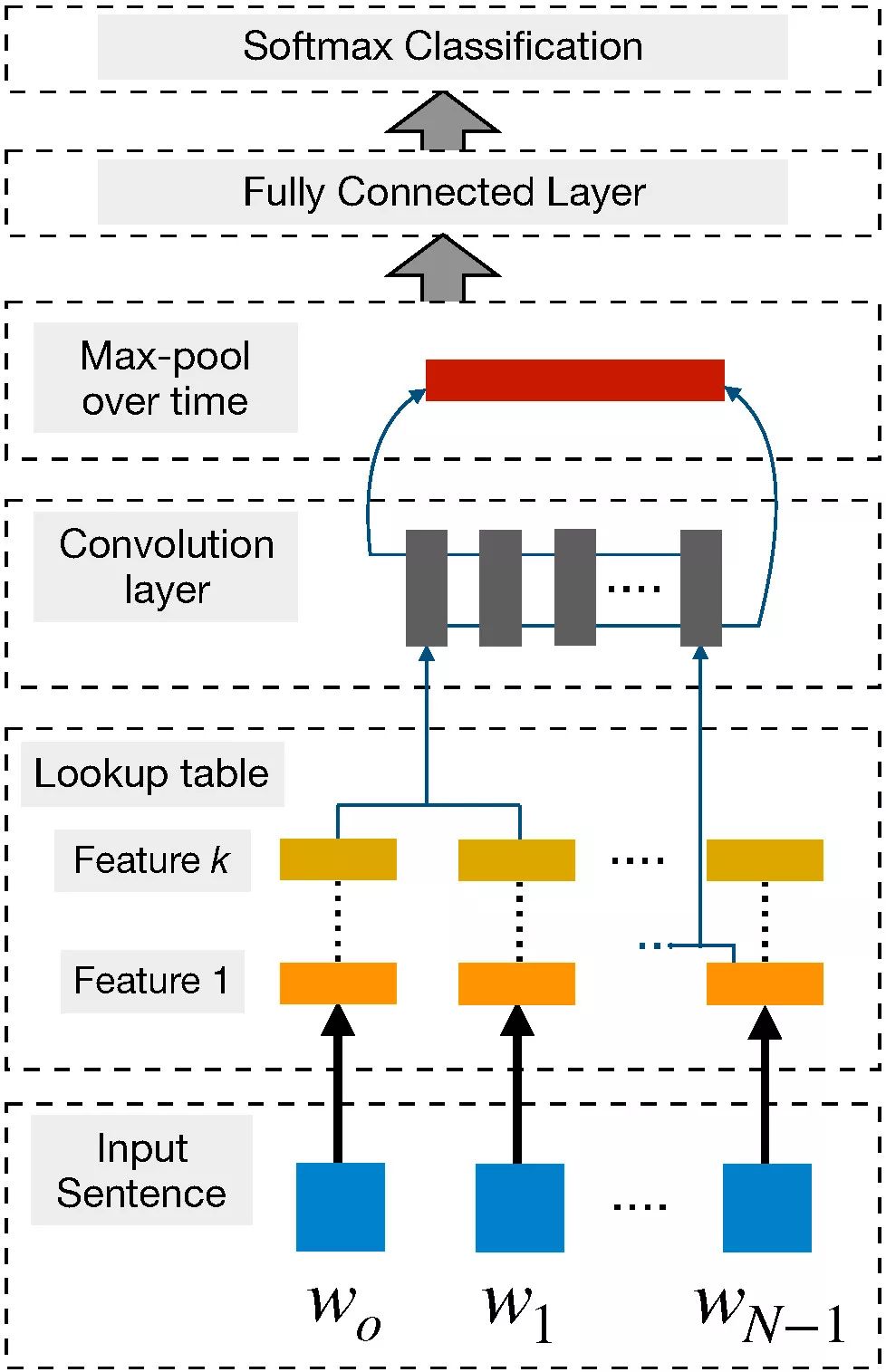 Kim 探讨了使用上述架构进行各种句子分类任务,包括情感、主观性和问题类型分类,结果很有竞争力。因其简单有效的特点,这种方法很快被研究者接受。在针对特定任务进行训练之后,随机初始化的卷积内核成为特定 n-gram 的特征检测器,这些检测器对于目标任务非常有用。但是这个网络有很多缺点,最主要的一点是 CNN 没有办法构建长距离依存关系。