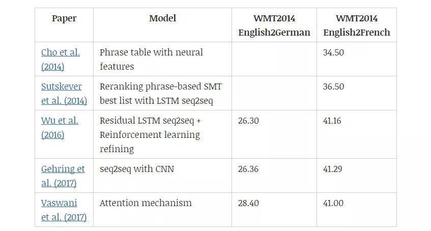 基于短语的 SMT 框架(Koehn et al., 2003)将翻译模型分解为原语短语和目标语短语之间的概率匹配问题。Cho et al. (2014) 进一步提出用 RNN 编码器-解码器框架学习原语与目标语的匹配概率。而基于循环神经网络的编码器-解码器架构,再加上注意力机制在一段时间内成为了业内最标准的架构。Gehring et al. (2017) 提出了基于 CNN 的 Seq2Seq 模型,CNN 以并行的方式利用注意力机制计算每一个词的表征,解码器再根据这些表征确定目标语序列。Vaswani et al. (2017) 随后提出了完全基于注意力机制的 Transformer,它目前已经是神经机器翻译最常见的架构了。