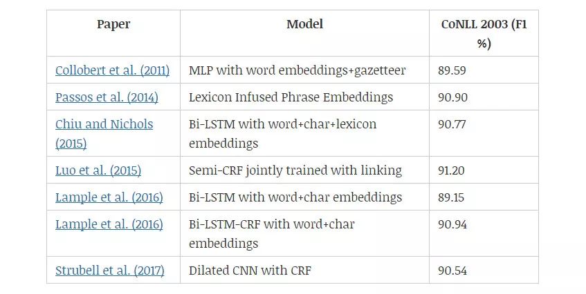 CoNLL 2003 是用于命名实体识别(NER)的标准英语数据集,其中主要包含四种命名实体:人、地点、组织和其它实体。NER 属于自然语言处理问题,其中词典非常有用。Collobert 等人(2011)首次通过用地名索引特征增强的神经架构实现了具有竞争性的结果。Chiu and Nichols(2015)将词典特征、字符嵌入和单词嵌入串联起来,然后将其作为双向 LSTM 的输入。