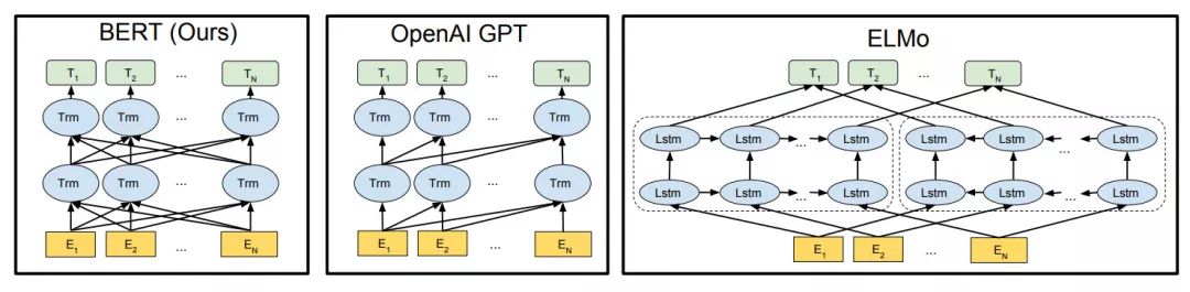 如上所示为不同预训练模型的架构,BERT 可以视为结合了 OpenAI GPT 和 ELMo 优势的新模型。其中 ELMo 使用两条独立训练的 LSTM 获取双向信息,而 OpenAI GPT 使用新型的 Transformer 和经典语言模型只能获取单向信息。