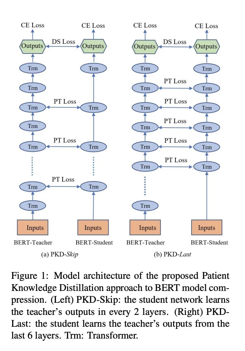 简单说,PKD的知识来源有两部分:中间层+最后输出,当然还有Hard labels。