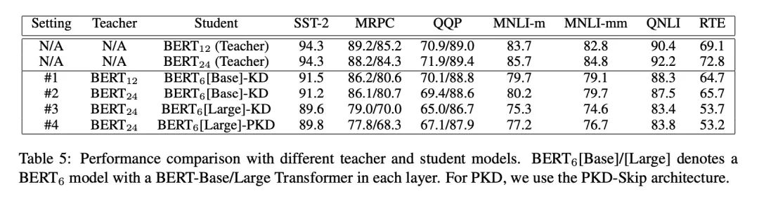 KD情况下,注意不是PKD模型,看#1 和#2,在老师网络增加的情况下,效果有好有坏。这个和训练数据大小有关。