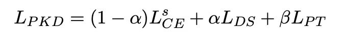 整个模型的损失主要是分为两个部分:KD损失和中间层的损失,如下: