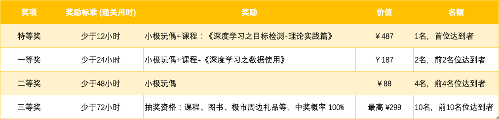 报名参与“新手任务”,完成模型训练、模型测试,成绩分大于0.1,视为成功通关。活动以通关用时为评奖标准,奖励设置如下。
